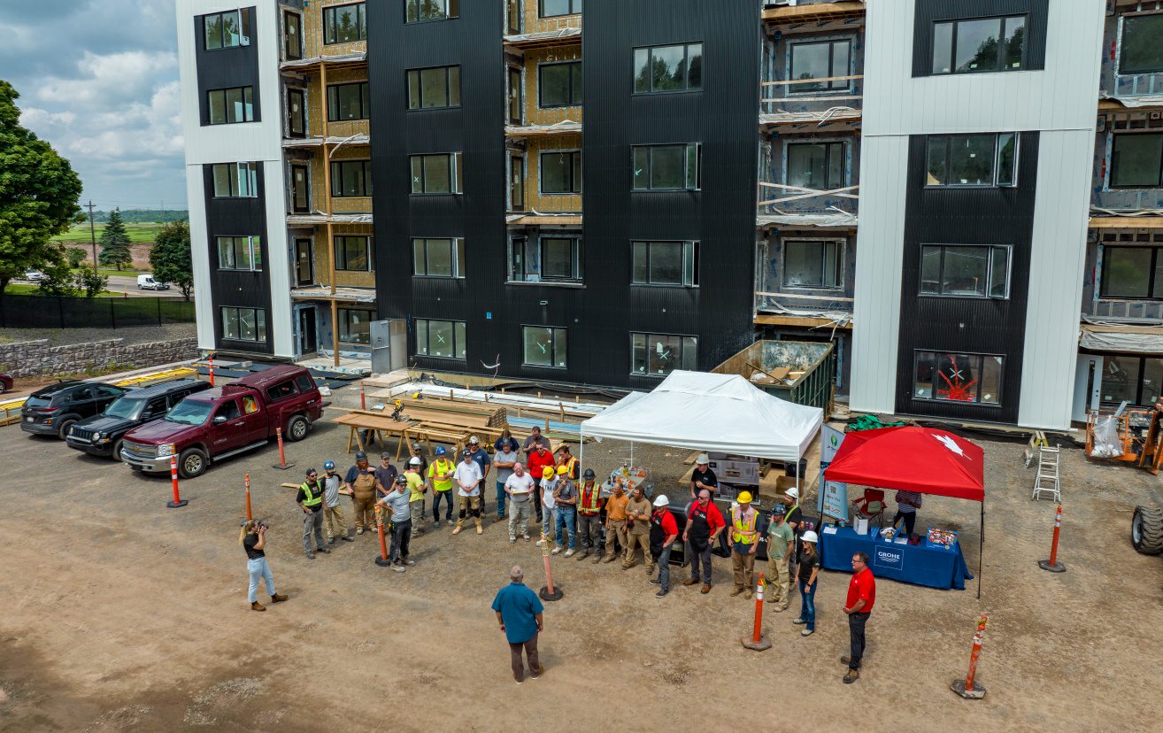 A high view shot of an apartment building under construction with people standing